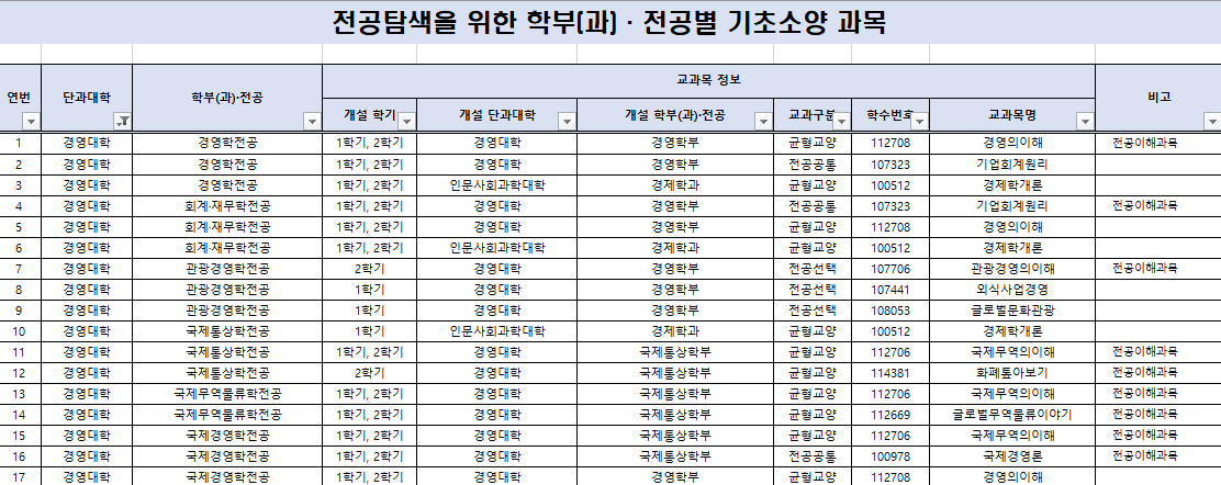 전공탐색을 위한 학부(과) 전공별 기초소양 과목 안내