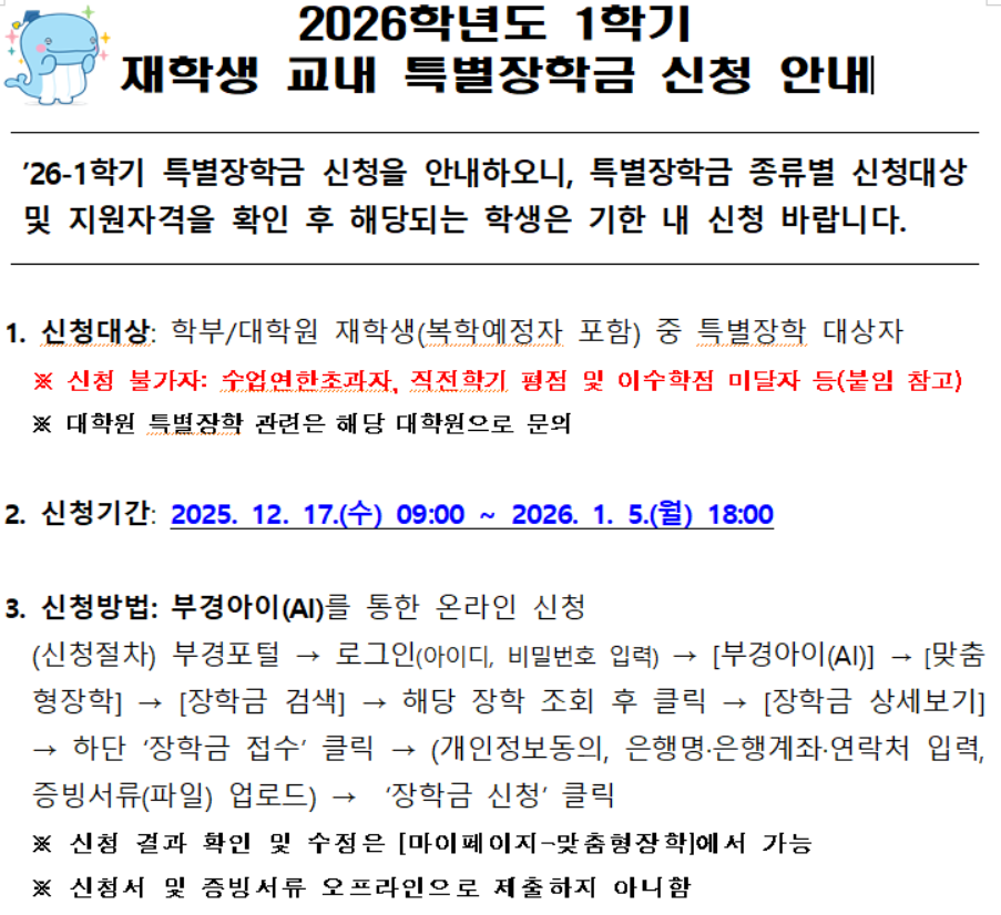 2026학년도 1학기 재학생 교내 특별장학금 신청 안내