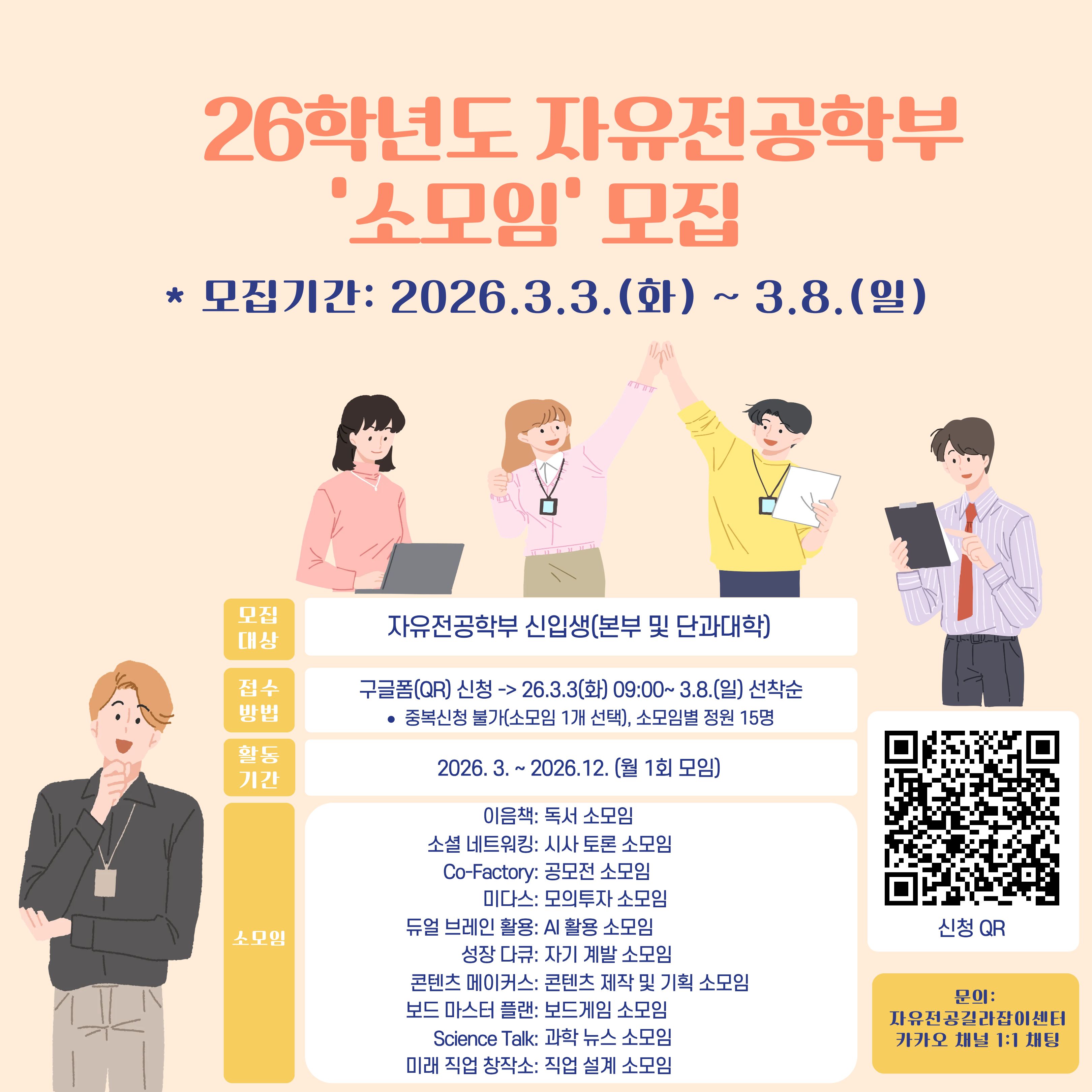 자유전공학부생을 대상으로 다양한 주제에 관한 소모임을 운영하오니, 관심있는 분야의 소모임을 신청하고 참여해보시기 바랍니다. 소모임별로 지도교수님과 함께 자유전공 오픈라운지 세미나실에서 진행됩니다. - 소모임 모집기간: 2026. 3. 3.(화) 09:00~ 3. 8.(일) 선착순 모집 - 모집대상: 본부 및 단과대학 자유전공학부 신입생 - 신청방법: 포스터 내 QR(구글폼)로 신청하기 - 활동기간: 2026. 3월~12월 (월 1회 정기모임, 학기별 네트워킹 데이 진행) - 소모임 운영시간: 소모임별 2개 분반 운영, 모임별로 요일과 진행 시간 상이 (2시간 진행) - 분반별 인원: 15명 (5명 이하로 모집시 해당 분반 미운영) * 문의사항은 카카오 채널 1:1 채팅으로 남겨주세요 :-) http://pf.kakao.com/_xkMJun/chat