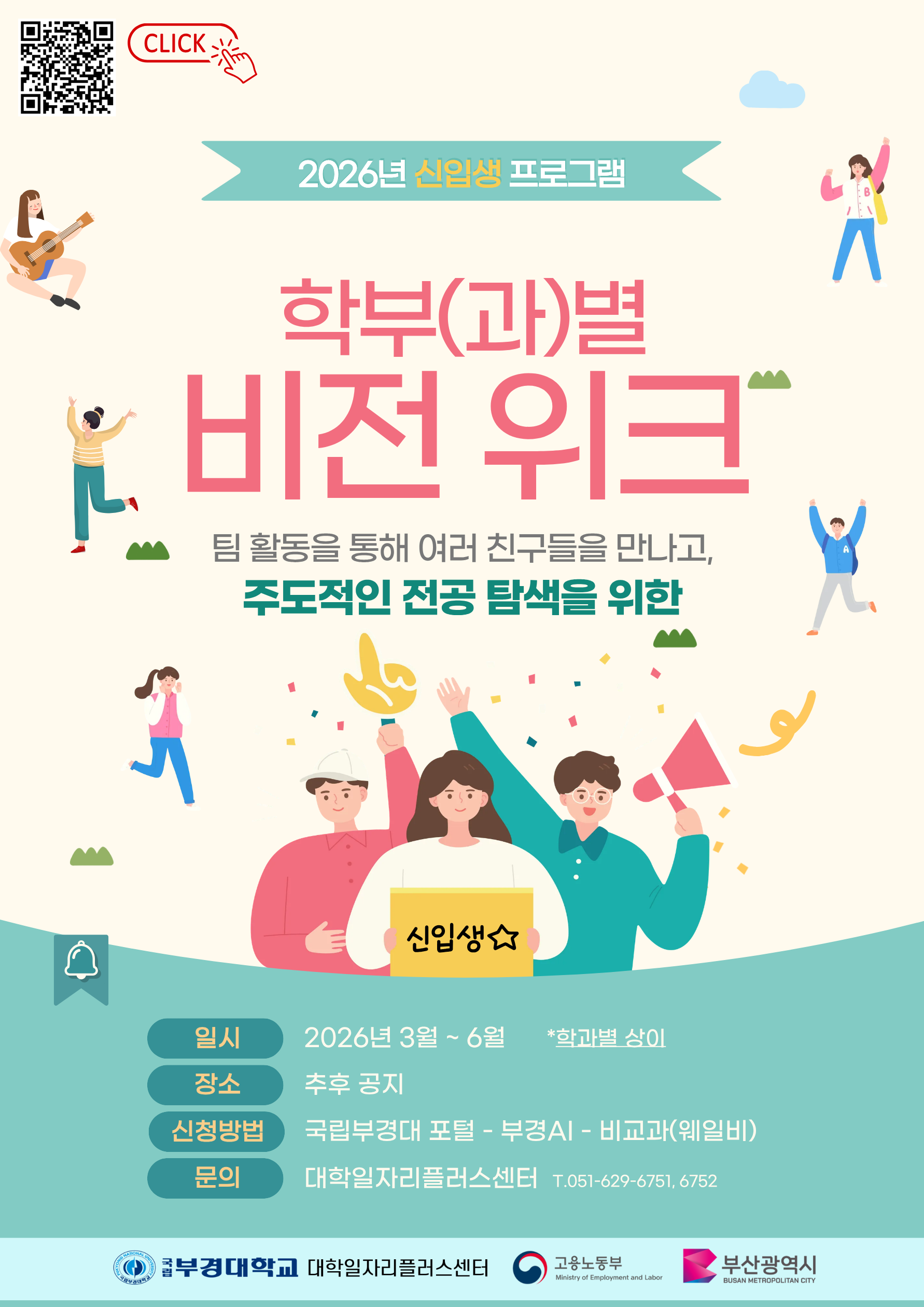 비교과 프로그램 '학부(과)별 비전 위크' 안내드립니다. 공지링크-> https://pknujob.pknu.ac.kr/main/30?action=view&no=25992&bbsId=2 ★ 프로그램 개요 1. 강의명 : 학부(과)별 비전 위크 2. 일 시 : 2026년 3월 ~ 6월 / 8시간(1일 4시간) *학과별 상이 / 추후 공지 3. 장 소 : 국립부경대 대연캠퍼스 (회차별 개별 공지) 4. 대 상 : 학부 신입생 (1학년) 5. 인 원 : 40명 6. 내 용 : 팀 활동과 나의 경험 분석을 통해 ‘나의 미래’와 ‘나의 비전’을 찾고 맞춤형 직무 및 전공 탐색 ★ 신청방법 및 안내사항 1. 신청기간 : 2026. 3. 6.(금) ~ 마감 시까지 2. 신청방법 : 부경아이AI 비교과을 통한 온라인 신청 *포털 → 부경아이AI → 비교과 프로그램 → '프로그램명' 검색 → 수강신청 3. 기 타 :선착순 마감 *타 단과대학 일정으로 수강을 원하시는 분께서는 담당자에게 연락바랍니다. ● 포털 접속 portal.pknu.ac.kr ※ 문의: 대학일자리플러스센터 프로그램 담당자(T. 051-629-6751)