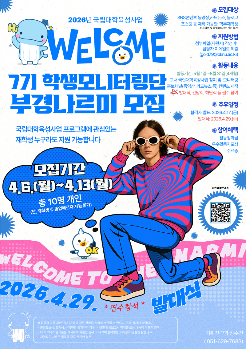 국립대학육성사업의 우수성과 발굴 및 공유·확산 등 환류체계 구축을 위해 제7기 학생모니터링단(부경나르미)을 아래와 같이 모집하오니, 관심있는 학생들의 많은 지원 바랍니다. 가. 모집대상: 학부 재학생(휴학생 및 졸업유보자 지원 불가) 나. 모집인원: 10명(개인) 다. 신청기간: 2026. 4. 6.(월) ~ 4. 13.(월) 16:00까지 라. 활동내용: 국립대학육성사업 프로그램 모니터링, 홍보자료 제작 등 마. 활동기간: 2026. 5. 1.(금) ~ 8. 31.(월) <4개월> 바. 참여혜택: 장학금 지급, 수료증 발급, 활동우수자 포상 등 사. 신청방법: 지원서 작성하여 이메일(gold79@pknu.ac.kr) 제출 |